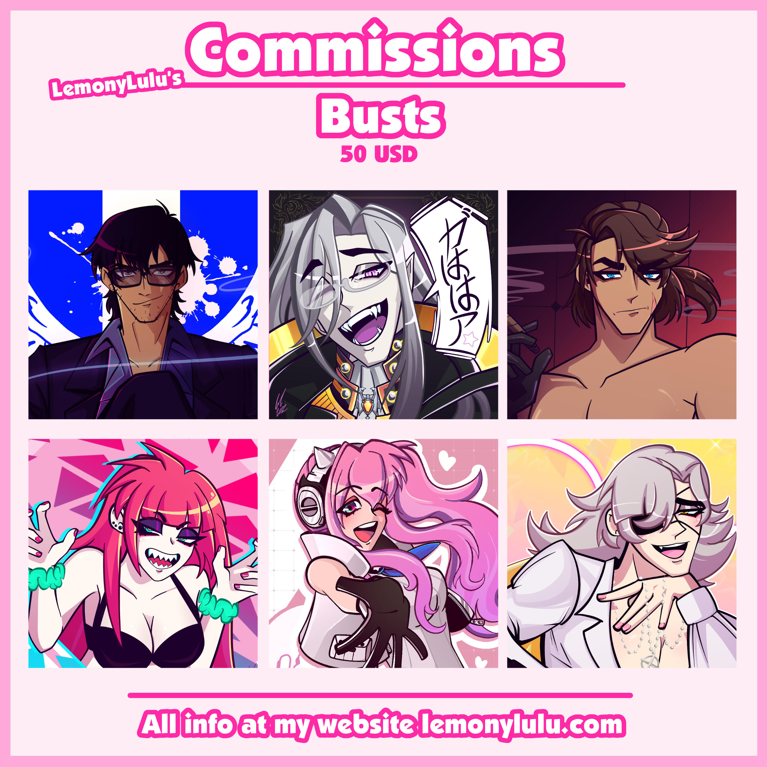 All pricing is for a full color, single character piece with a simple BG [solid color or abstract]. Please ask about multi character commissions. Highly complex designs or pieces may be subject to additional fees.